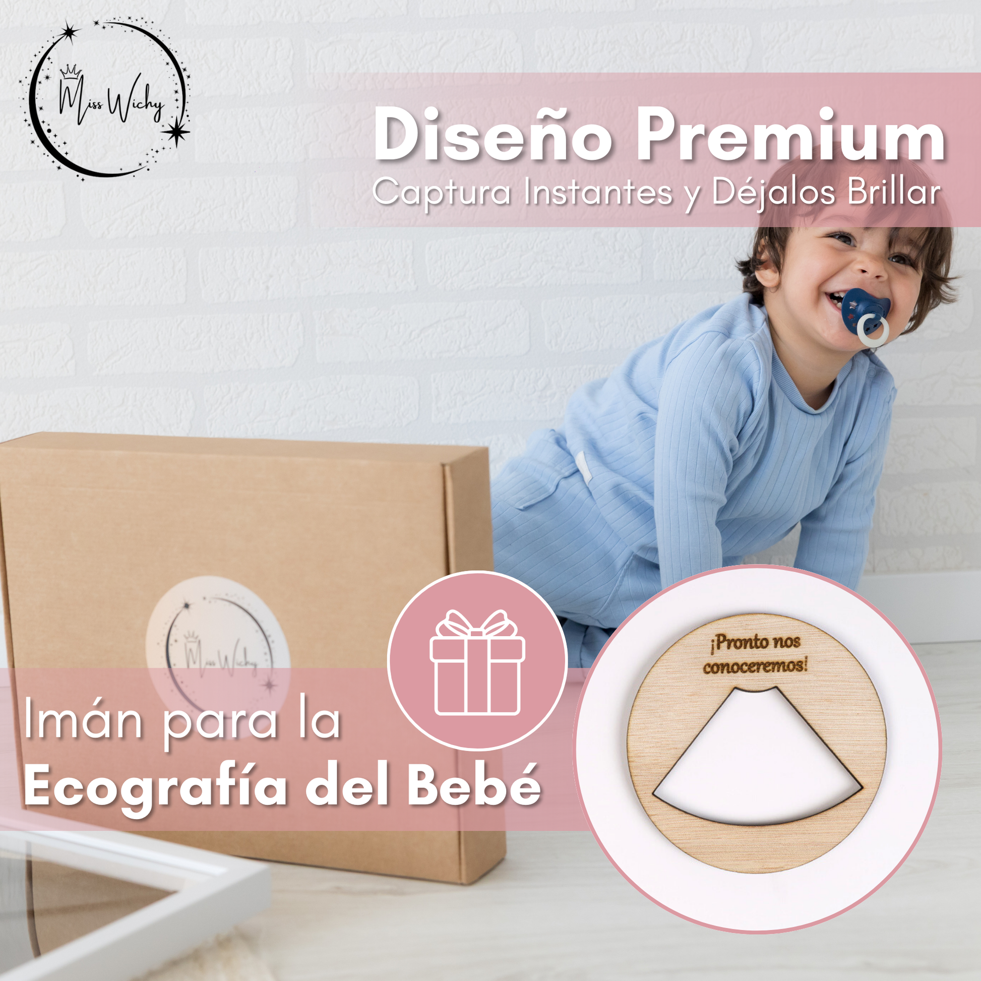 incluye un imán personalizado donde podrás colocar la foto del bebé, su